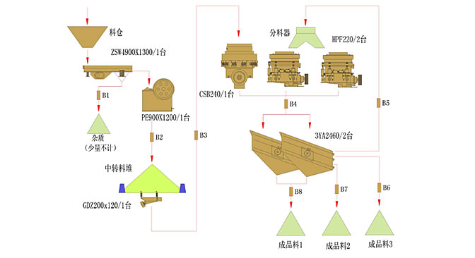 該公司(si)為(wei)實力雄厚的大型石料有(you)限公司(si) 從我司(si)購入PE900*1200顎破、HPC220圓(yuan)(yuan)錐破兩(liang)套、CSB240B圓(yuan)(yuan)錐破、ZSW490*130給料機、GZD*120給料機兩(liang)臺、3YA2160振動(dong)篩兩(liang)臺